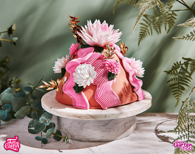 Vind je deze dome taart er niet fantastisch uitzien? Deze dome taart is een echte blikvanger en perfect voor wie eens iets anders wil dan een standaard ronde taart. Dankzij de bolvorm krijgt de taart een unieke uitstraling, en de frisse kleuren maken hem ideaal voor een lente- of zomerfeest. Wat deze taart helemaal af maakt, zijn natuurlijk de prachtige eetbare bloemen van FunCakes. Deze eetbare taartdecoratie geeft echt het wow-effect, en dat terwijl het zo makkelijk is om te gebruiken!