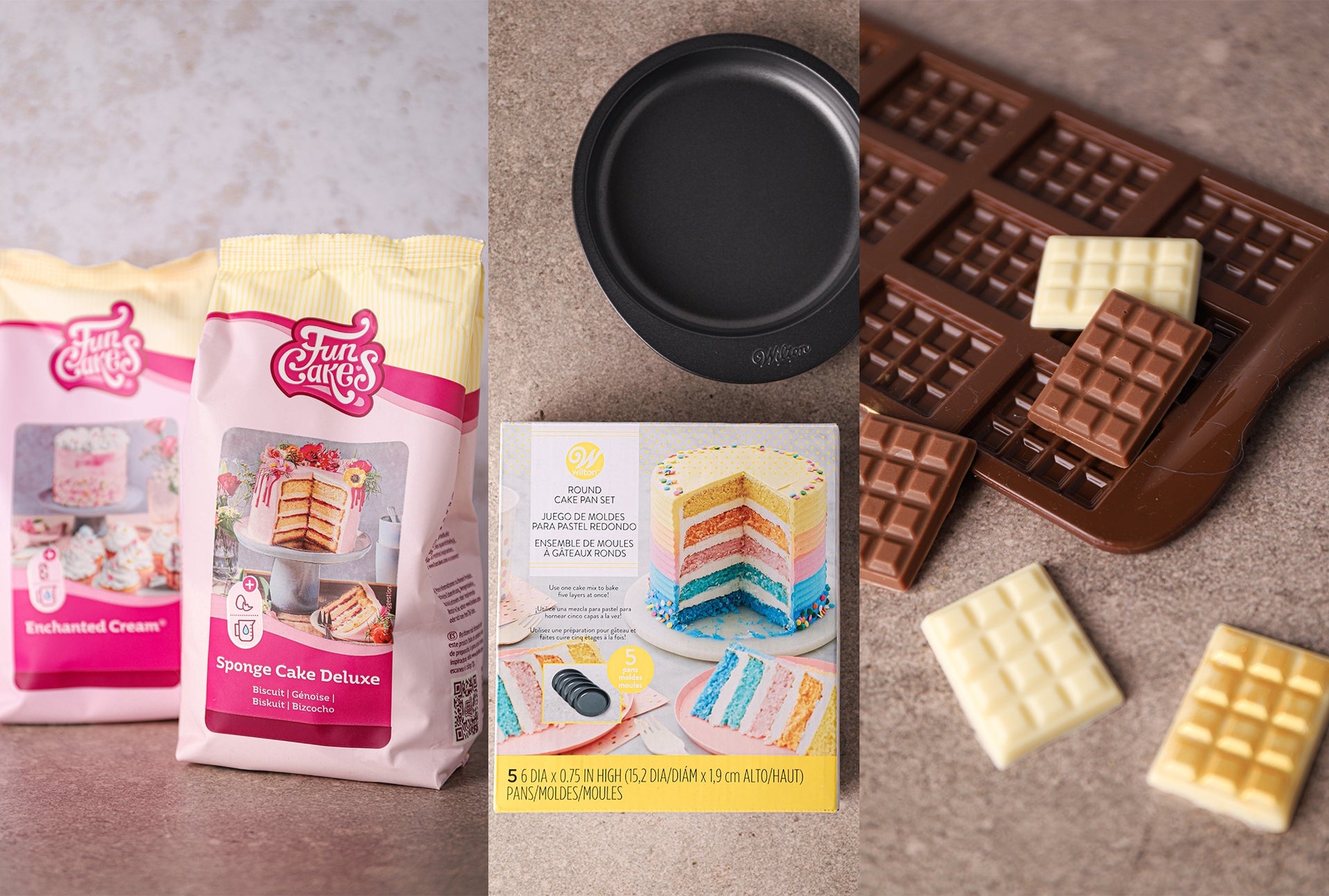 Voor de verschillende lagen heeft Eefje de Wilton Vijflaagse Bakvorm rond Easy Layers pannen gebruikt, een hele handige set waar je alle taartlagen apart kunt bakken. Leuk voor als je allemaal verschillende kleuren wilt bakken!