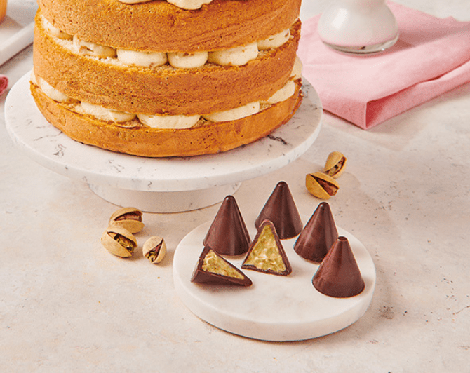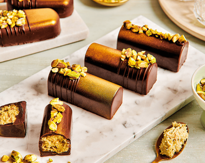 Als we het hebben over de Dubai-trend, draait alles om elegantie en smaakexplosies. Denk aan rijke chocolade, verrassende texturen en een vleugje Midden-Oosten. En daar past de Crunchy Pistache spread perfect bij. Met zijn romige pistachesmaak en subtiele crunch van koekstukjes, is het dé basis voor jouw creaties. Of je nu een feestje geeft of gewoon iets speciaals voor jezelf wilt maken, de Dubai-trend geeft jouw baksels die extra wauw-factor. Van prachtig gedecoreerde bonbons tot de onweerstaanbare Dubai reep – je bakcreaties krijgen gegarandeerd een luxueuze uitstraling.