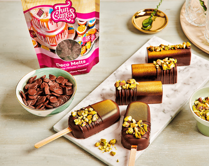 Met de FunCakes Deco Melts maak je in een handomdraai elegante bonbons gevuld met de Crunchy Pistache spread. Een ideale combinatie van een romige vulling met een stevige chocolaag. Perfect als luxe cadeautje of voor bij de koffie.