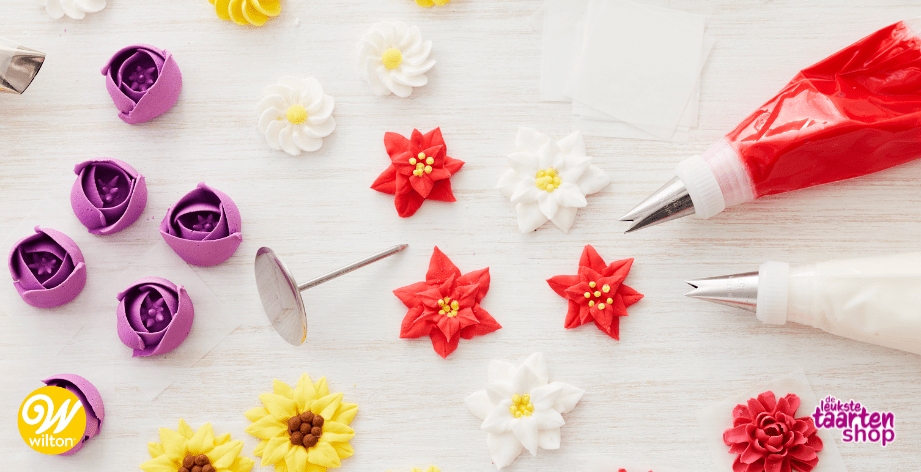 Bloemen van botercrème, royal icing of Enchanted Cream® geven je taarten en cupcakes een elegante uitstraling. Voor rozen gebruik je een stervormige spuitmond als de Wilton #1M of #2D. Wil je meer gedetailleerde bloemen zoals madeliefjes of zonnebloemen maken, dan is een bloembladspuitmond als #104 van Wilton ideaal. Met de brede, platte opening spuit je perfecte bloembladen op.