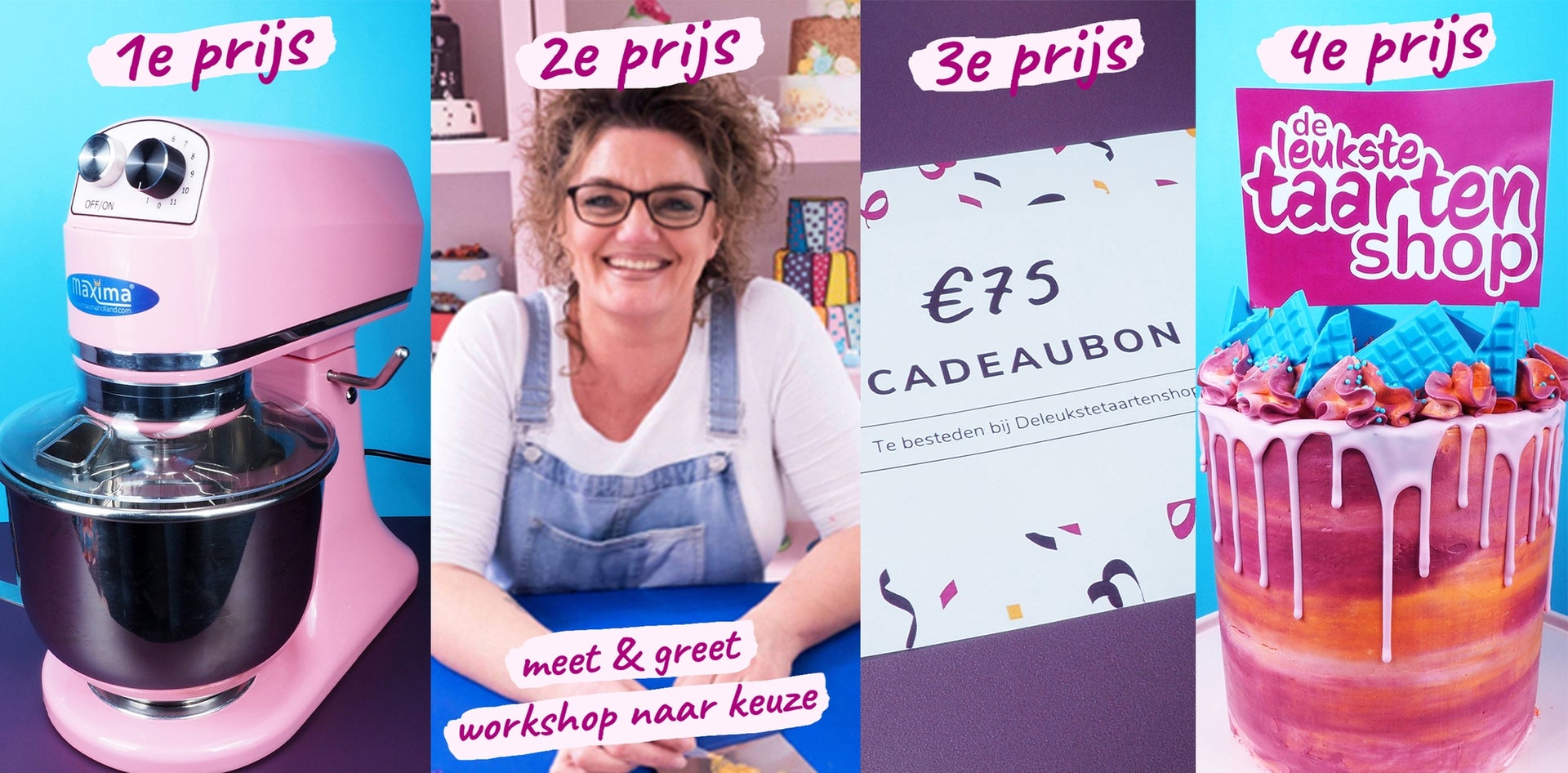Wij verloten de prijzen onder iedereen die deze maand voor 12 augustus een bestelling doet bij Deleukstetaartenshop.nl met een minimale orderwaarde van €40,-. Bestel jij deze maand dus voor minimaal €40,- aan bakspullen? Dan maak je automatisch kans!